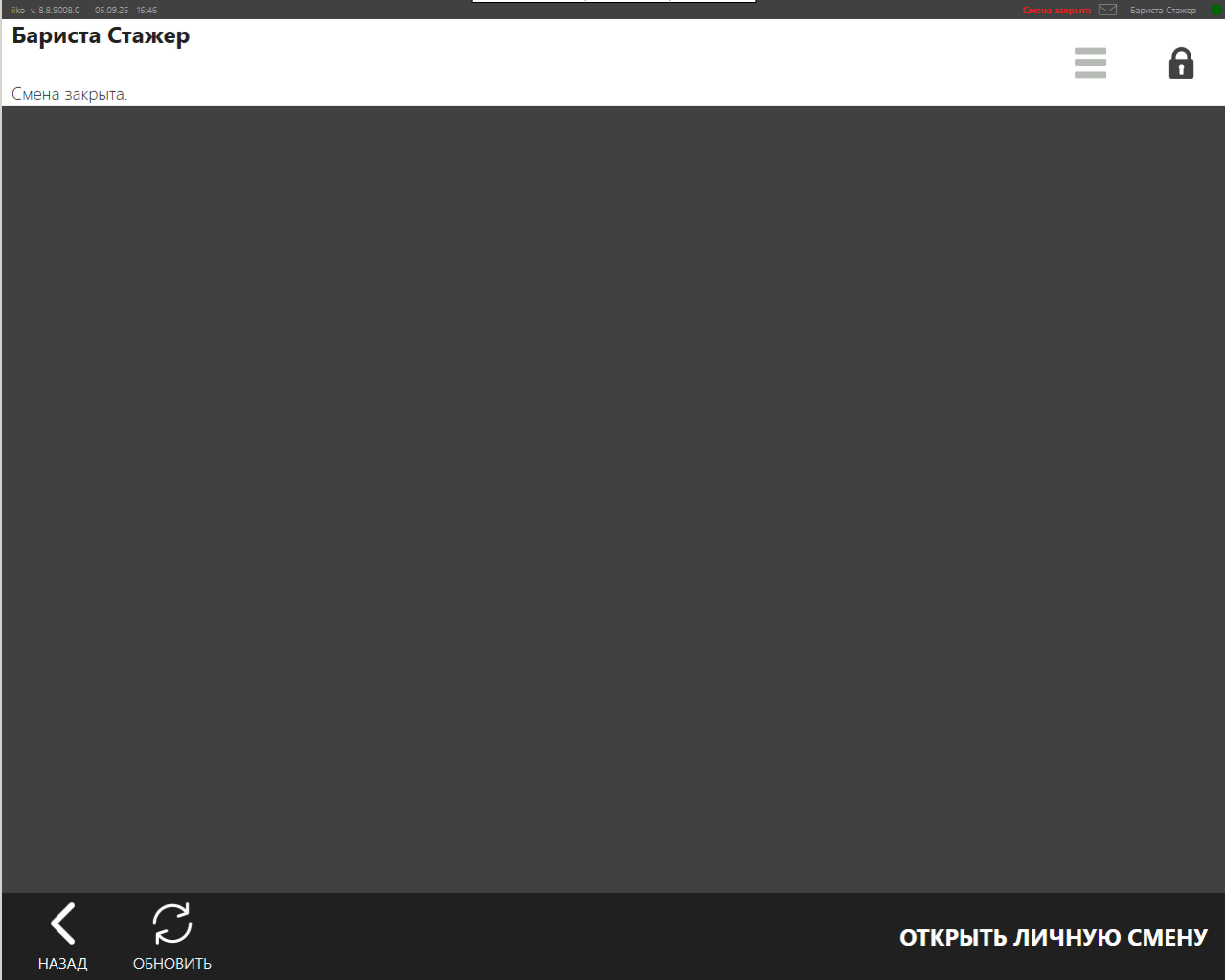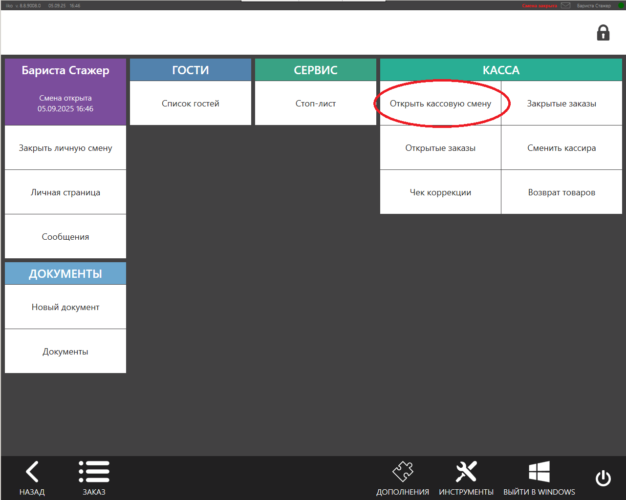 Открытие кассовой смены происходит перед открытием кофейни для гостей (до 8:00/9:00).