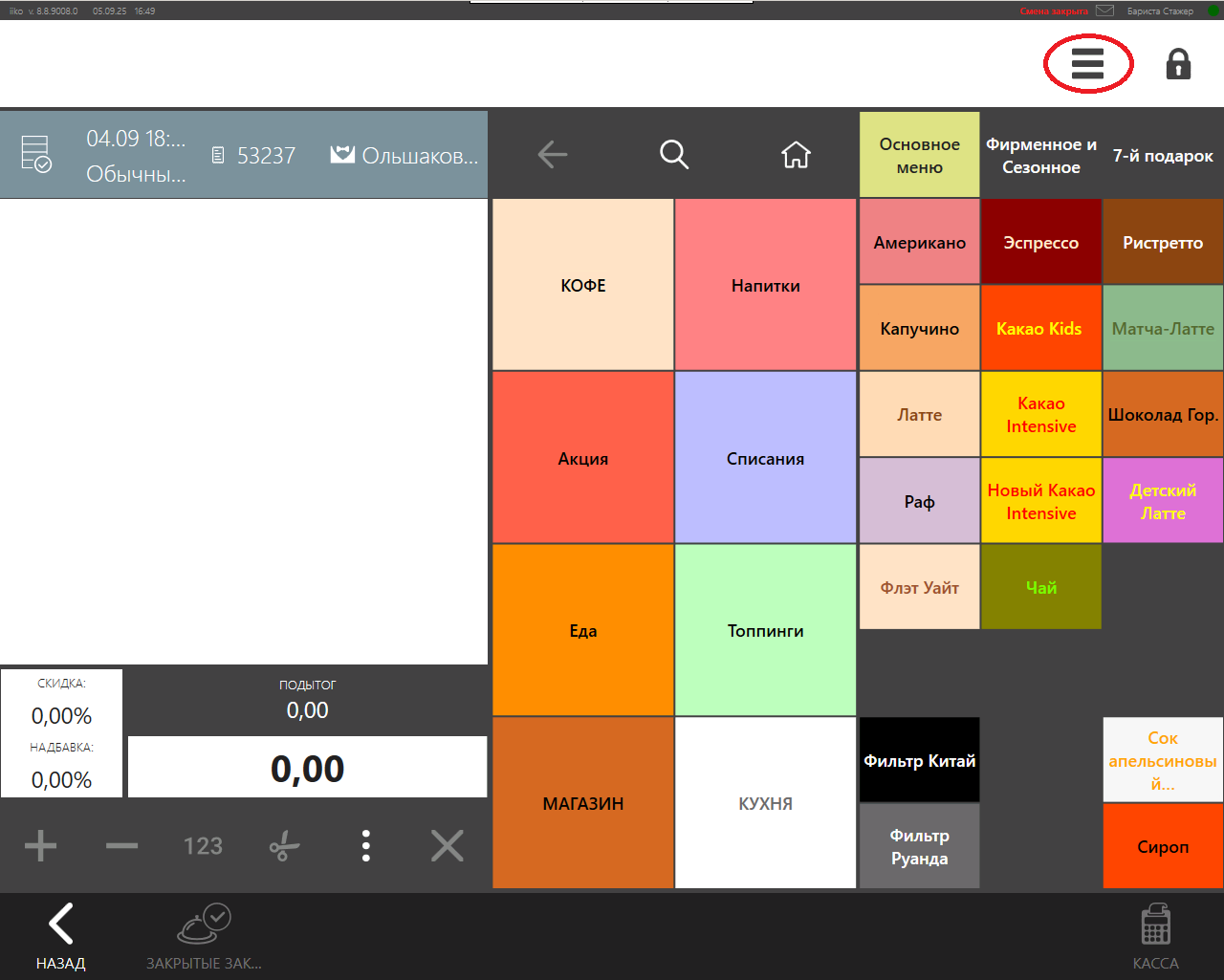 Из листа заказа выходим в техническое меню - кнопка в правом верхнем углу.